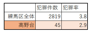 令和3年の練馬区全体の犯罪件数は計2819件で、高野台エリアだけで見ると45件になります。