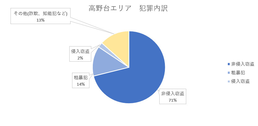 凶悪犯ゼロで侵入窃盗、粗暴犯も少なく、治安は良い地域と言えます。